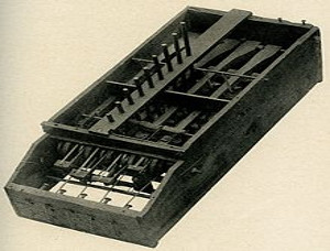 A este modelo se le denomina caja de macarrones porque su carcasa estaba formada por una caja de macarrones. Las teclas eran pinchos de carnicería, las guías principales formadas por grapas de herrería y una variedad de bandas elásticas que se utilizaban para los muelles. En la siguiente imagen se puede ver el modelo más primitivo de un comptómetro: