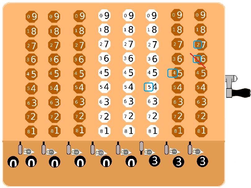 Para restar primero introducimos el minuendo deseado. Activamos el inhibidor del resto en la primera cifra del minuendo y luego utilizamos el complemento a 9 (números pequeños en las teclas) cuando introducimos el sustraendo. La última cifra del sustraendo la introducimos pero restándole 1.