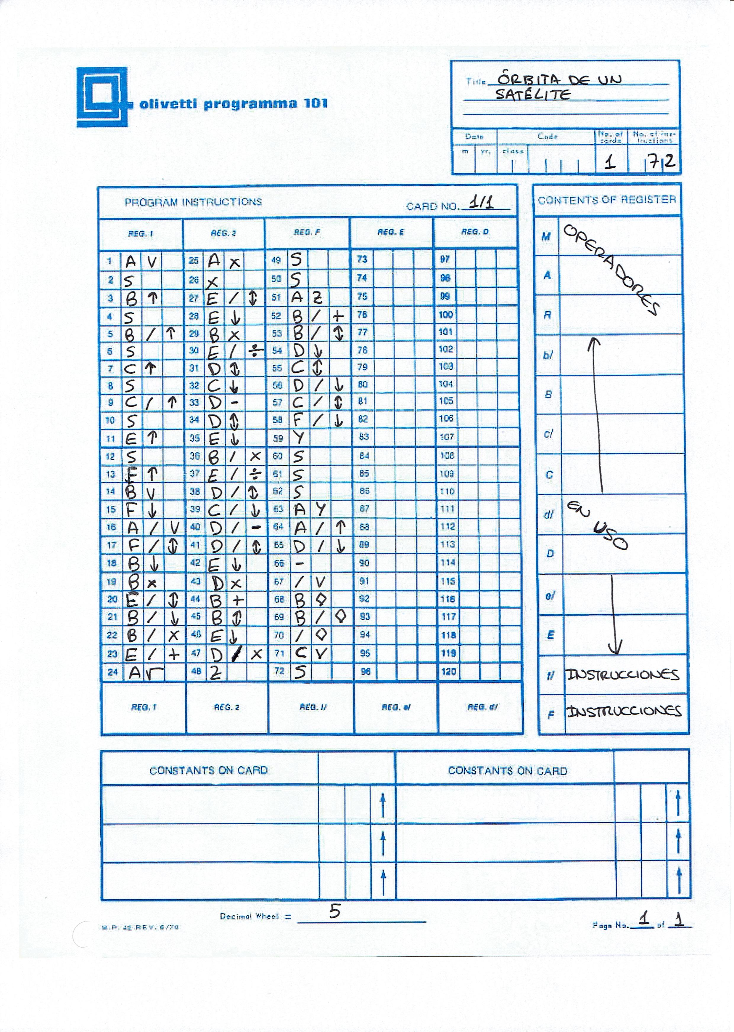 Two of these registers were reserved for the program, they had a capacity of 48 instructions and the rest of registers –denominated M, A, R, B, C, D, E y F– were directed to the data storage: M, A, R for operations and D, E, F for storage and program.