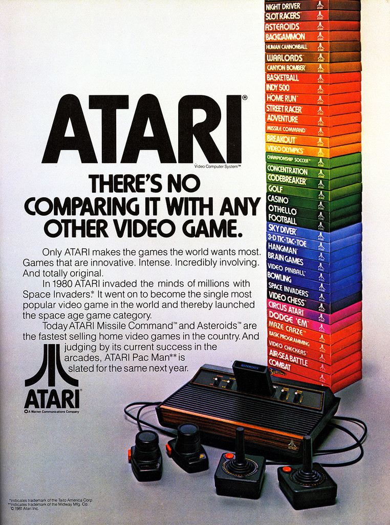 L’empresa Atari va tindre el seu major èxit amb un dels seus productes, que res té a veure amb el tema dels ordinadors del qual hem parlat. Atari va començar com a empresa de màquines arcade i amb el joc Pong. Així que no és d’estranyar que la seua fama arribara amb una consola de videojocs que van fabricar. Aquesta consola era la Atari VCS, més coneguda com Atari 2600. En ella s’inserien mitjançant cartutxos els jocs, es connectava a una pantalla de televisió i usant el “joystick” que venia en la caixa es començava a jugar. Atari va desenvolupar molts jocs per a aquesta consola i unit a això disposava d’unes bones prestacions que li van fer guanyar molts clients.